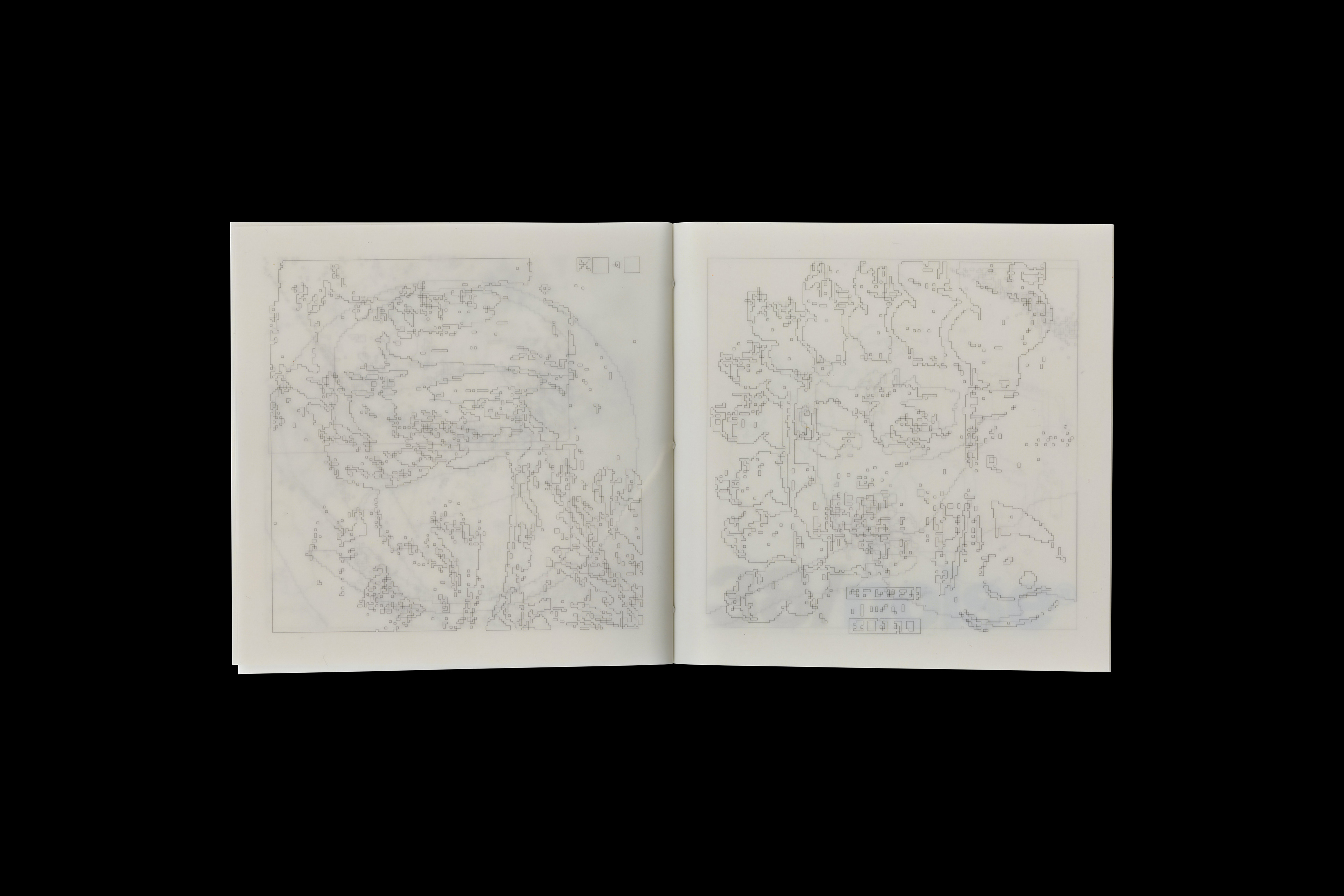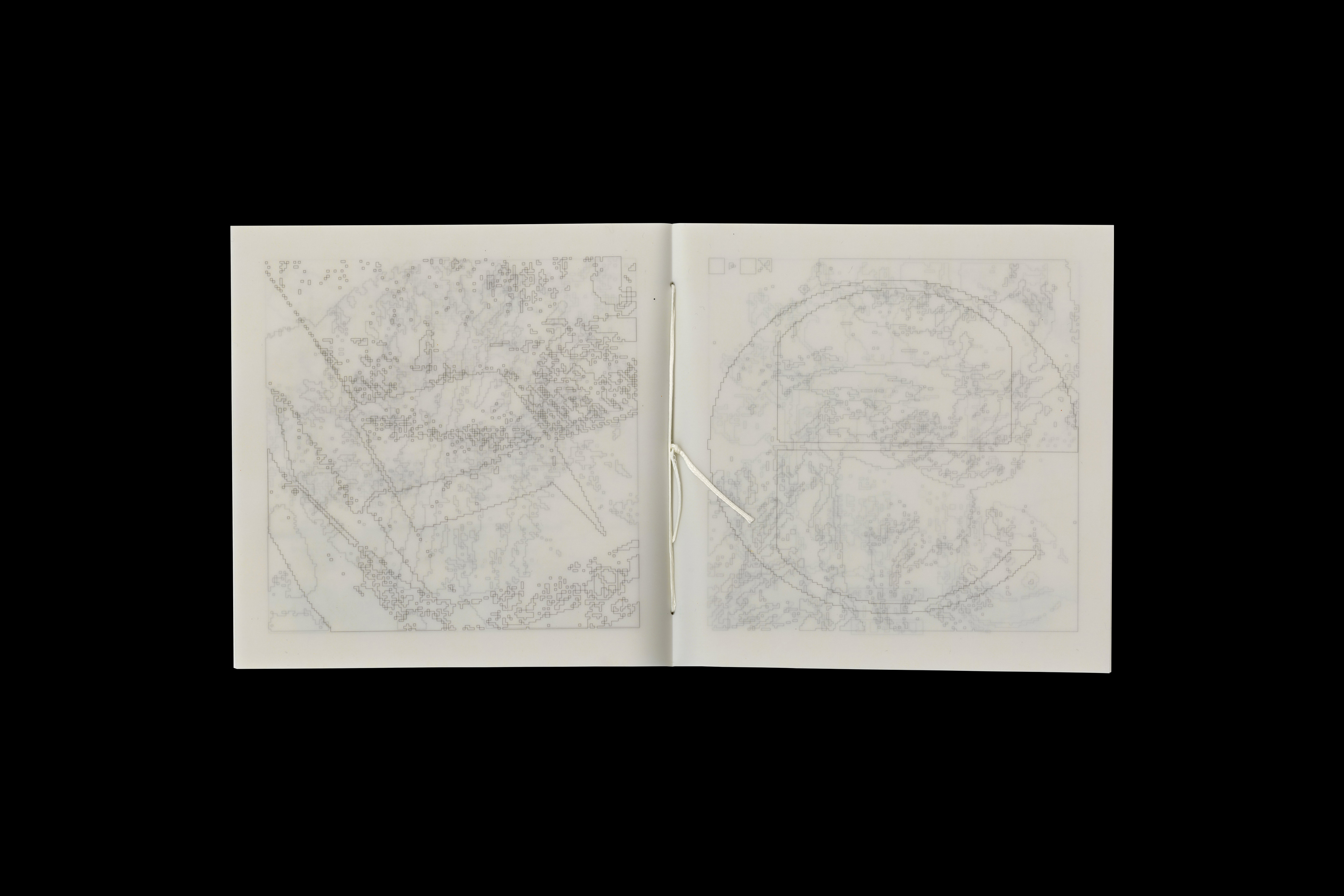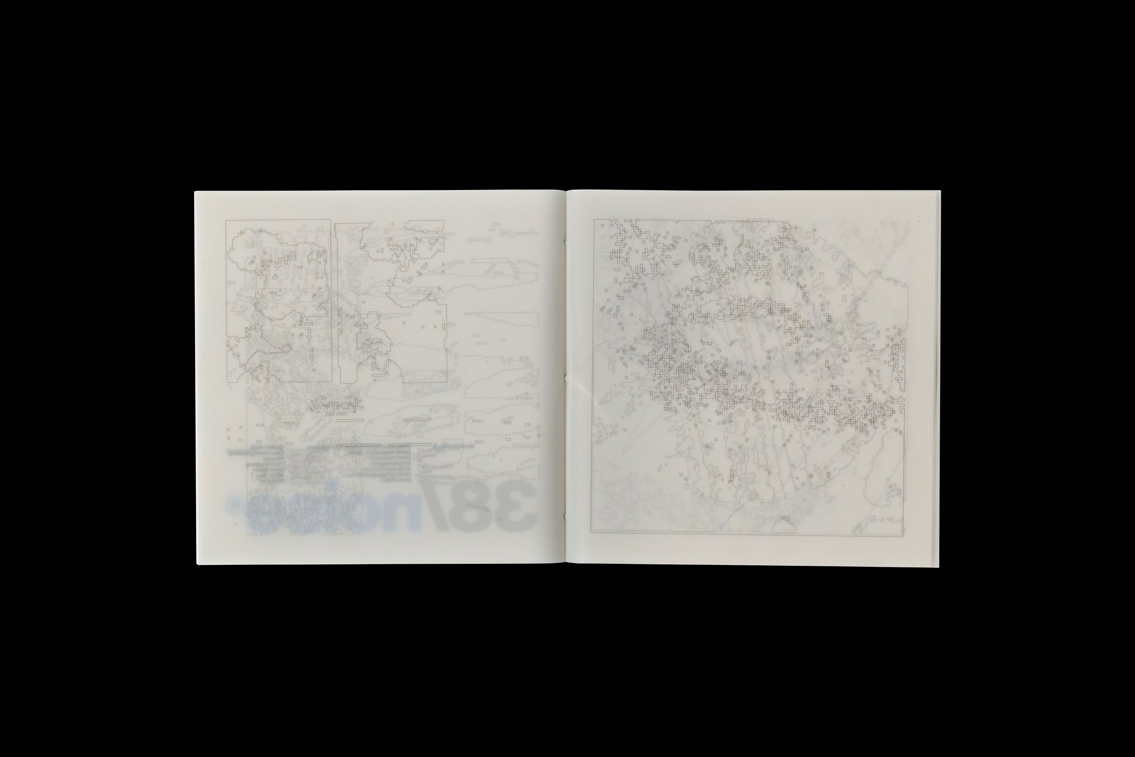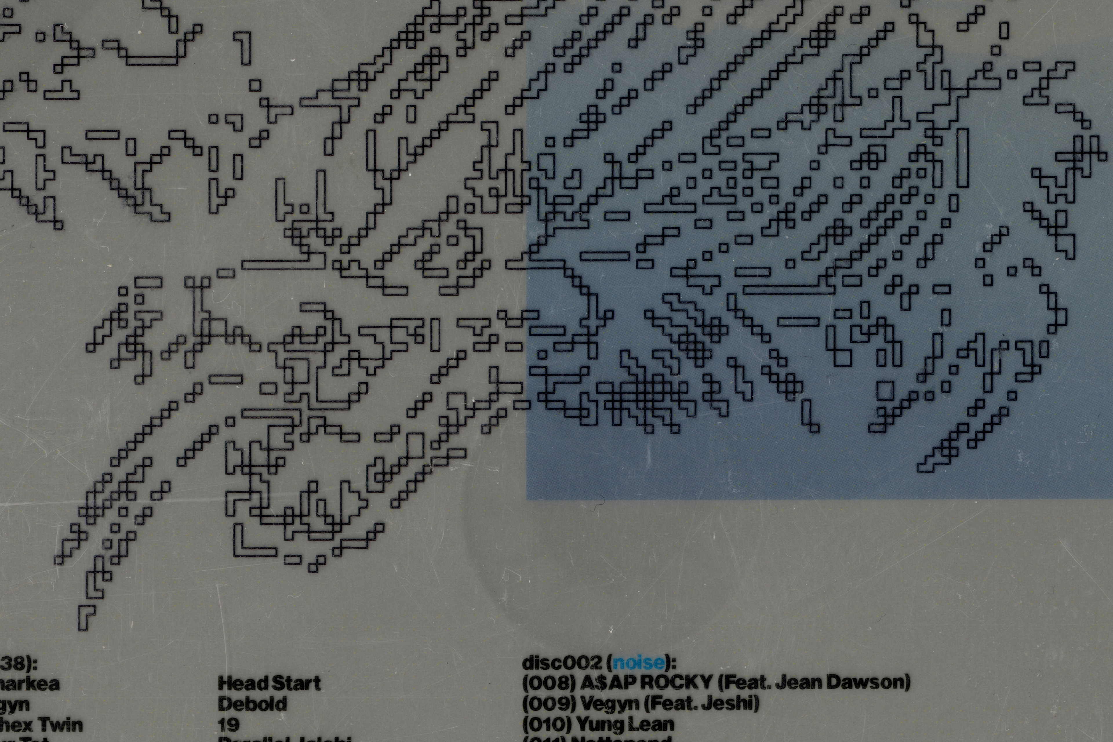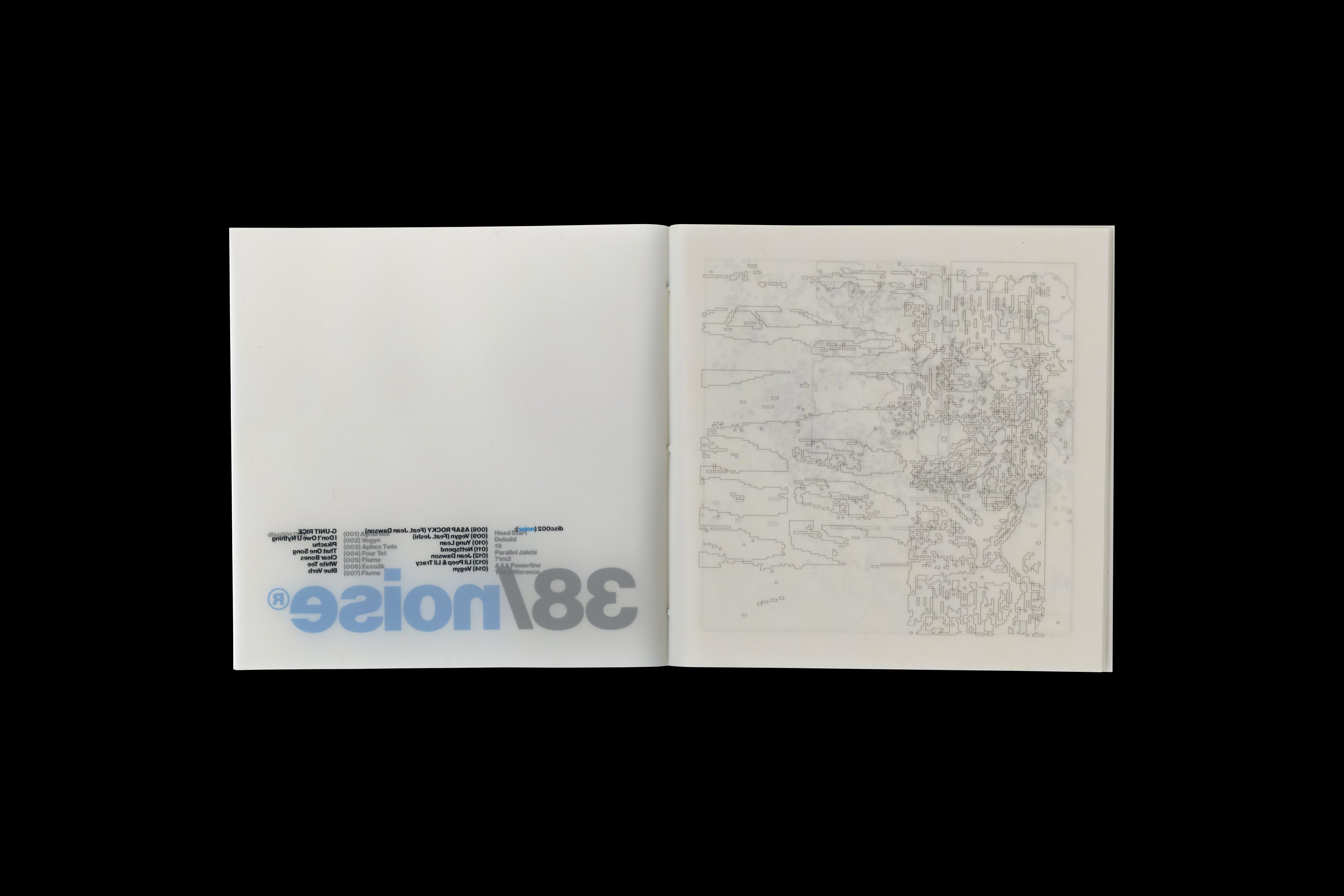 The front and back cover are printed onto two analog layers: engineering grade drafting film (semi translucent) and 100mic overhead projector film (fully translucent). The internal booklet also uses drafting film and is saddle-stitch bound by hand. It contains 14 pages of bitmapped + livetraced album artwork